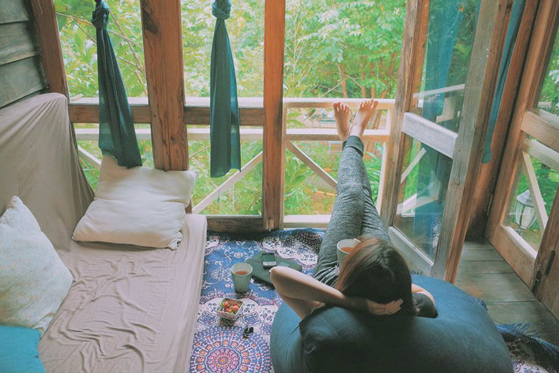 Nơi đây nổi bật với màu xanh giản dị của gỗ, cái hoài cổ bình yên của góc sân con con. Đây đúng là nơi trú ngụ lý tưởng cho các bạn thích sự mộc mạc của cuộc sống thường ngày, sáng đi tưới cây, trưa về nấu nướng, tối nằm đọc sách. Thi vị, bình yên đến lạ.