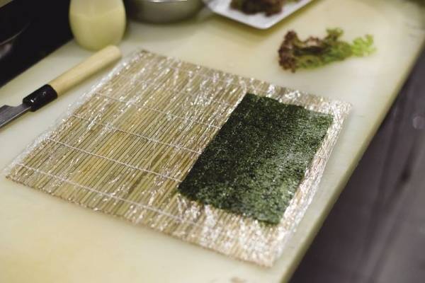 2. Trải một tấm rong biển nori trên bề mặt cắt sushi hoặc mặt bàn sạch.